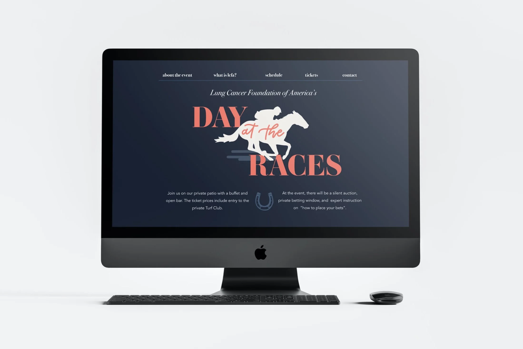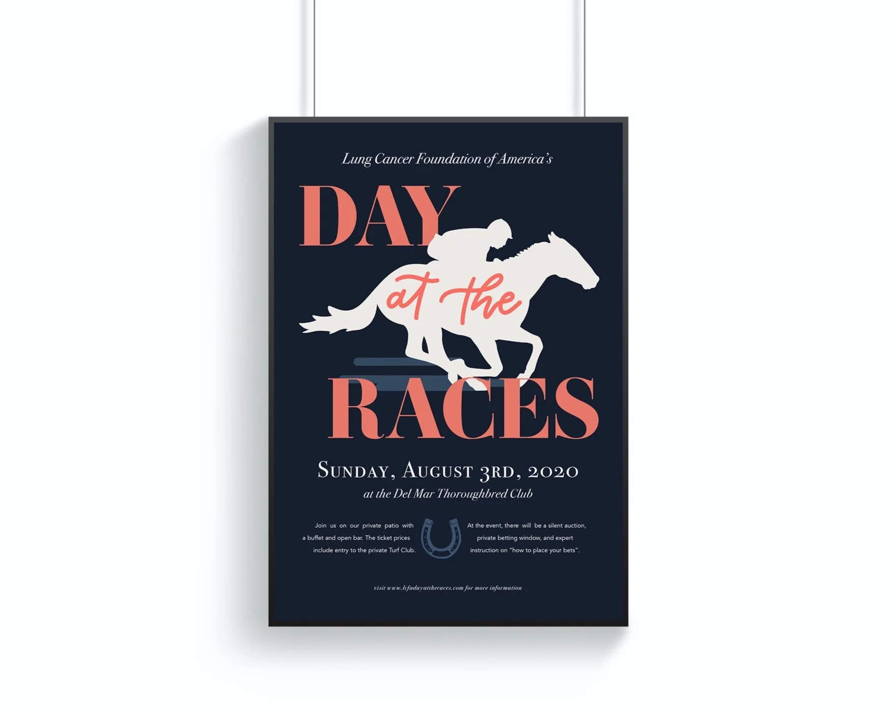 Day at the Races, an event supported by the Lung Cancer Foundation of America, is an annual horse race in Del Mar, California. Although the event focuses on lung cancer awareness, the branding assets emphasize the sophistication of the race. The branding includes a poster, website landing page, guest pass and notebook for the user to take note of which horses they are bidding on. The goal was for it to feel as if the viewer was attending the Kentucky Derby with the serif font and deep navy backgrounds.